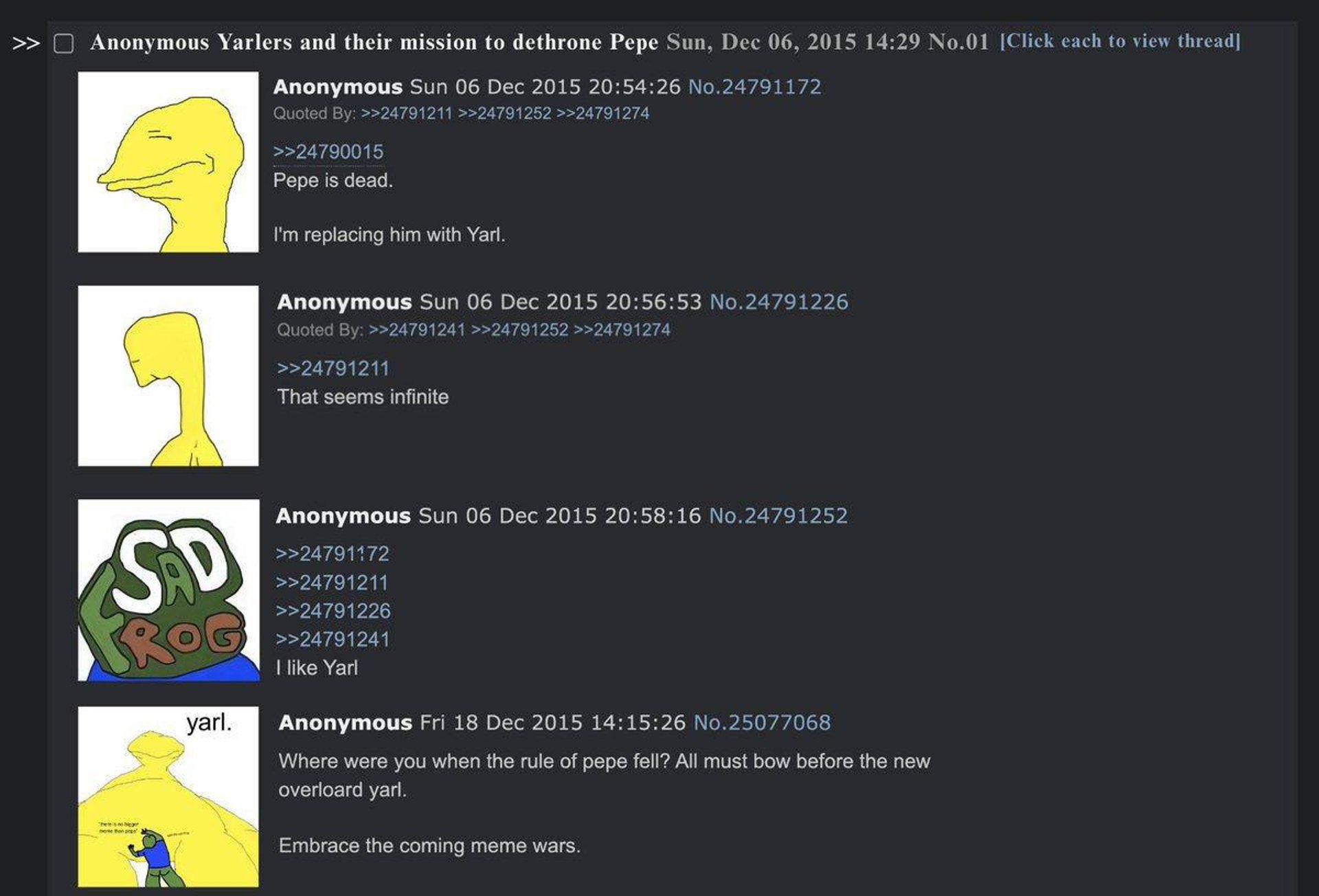 In the year of 2015 a anonymous user on 4chans board /r9k created a new meme with the goal to replace pepe. He wrote"Pepe is dead, I'm replacing him with Yarl". Pepe grew in popularity while Yarl stayed in the shadows. A group of people on 4Chan rallied around the mission to replace pepe and thus the "Cult of anonymous yarlers" was born. Yarl have live and have settled in his own country, The republic of Yarlistan.